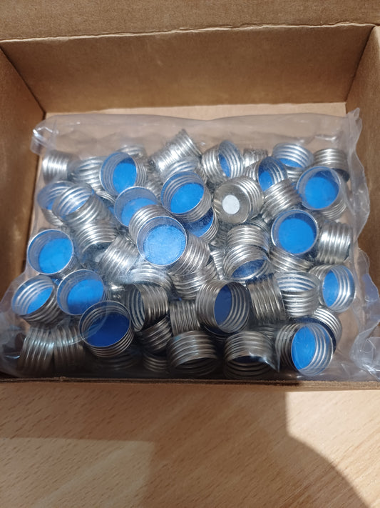 8010-0119 Agilent Caps/septa, screw, headspace, 18 mm, silver aluminum, blue PTFE/silicone septa, 100/pk